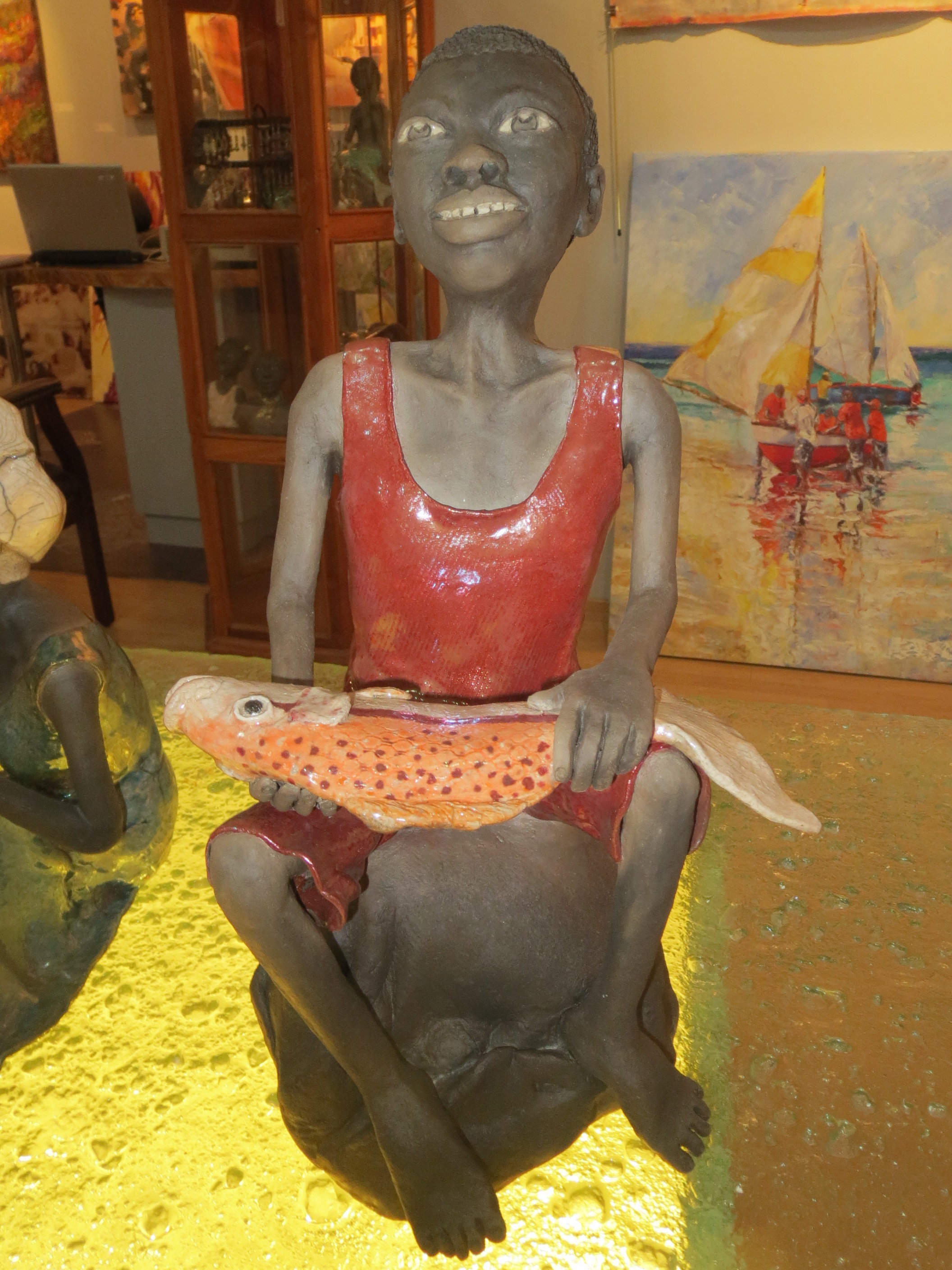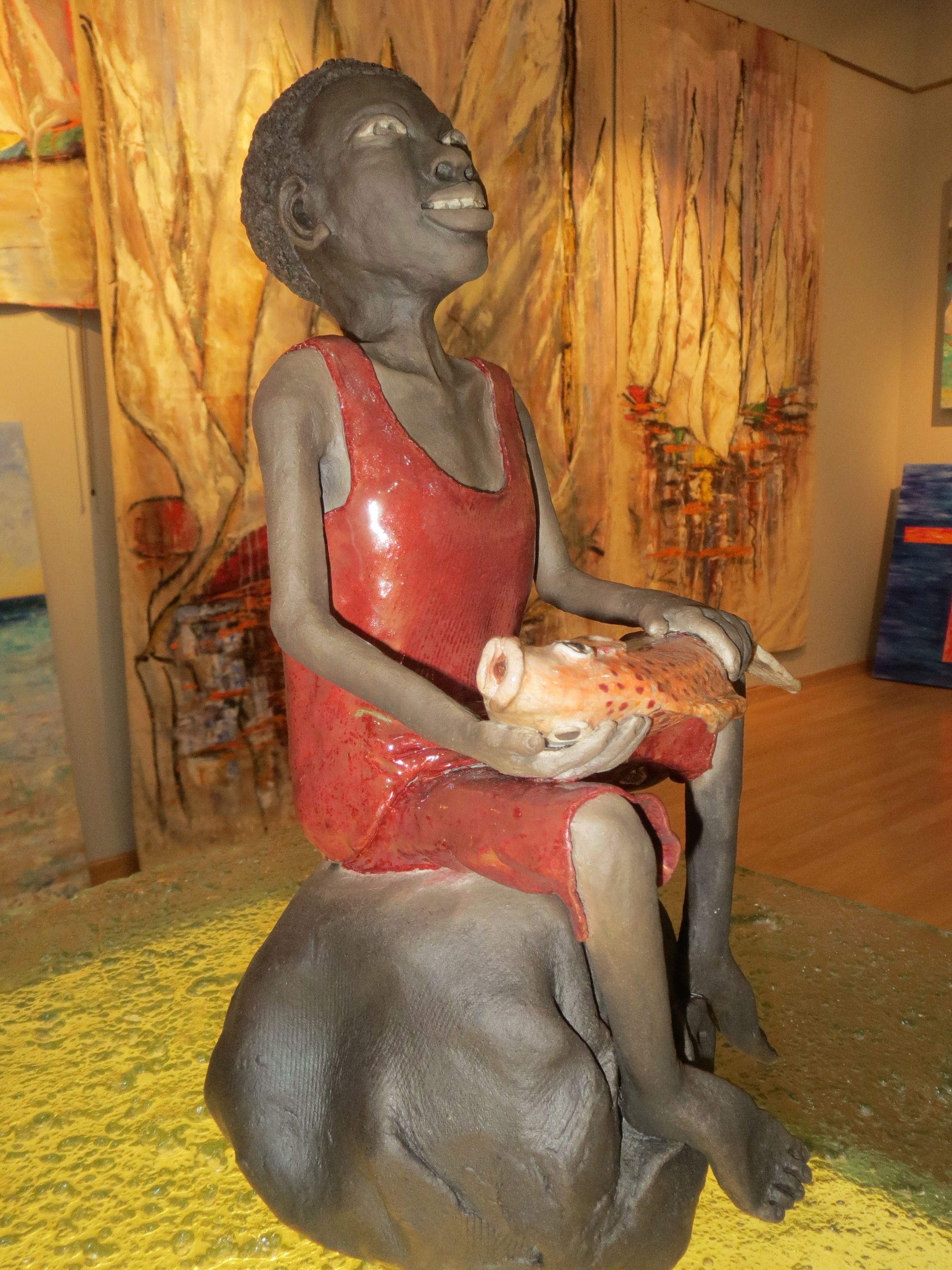 Marie Messenger, our local magician with ceramic, brought in this beautiful piece that we caught her in video doing on January 1, 2013. Samuel is so amazing, sitting there in his firy red shirt, holding his red fish. All the details so perfectly and elegantly captured by Marie. Here he will sit until he moves on to his home somewhere in the world. Could be with you.