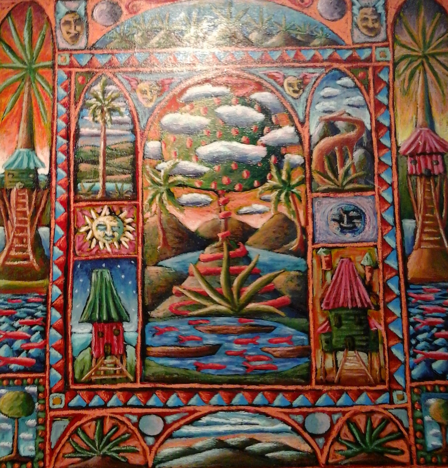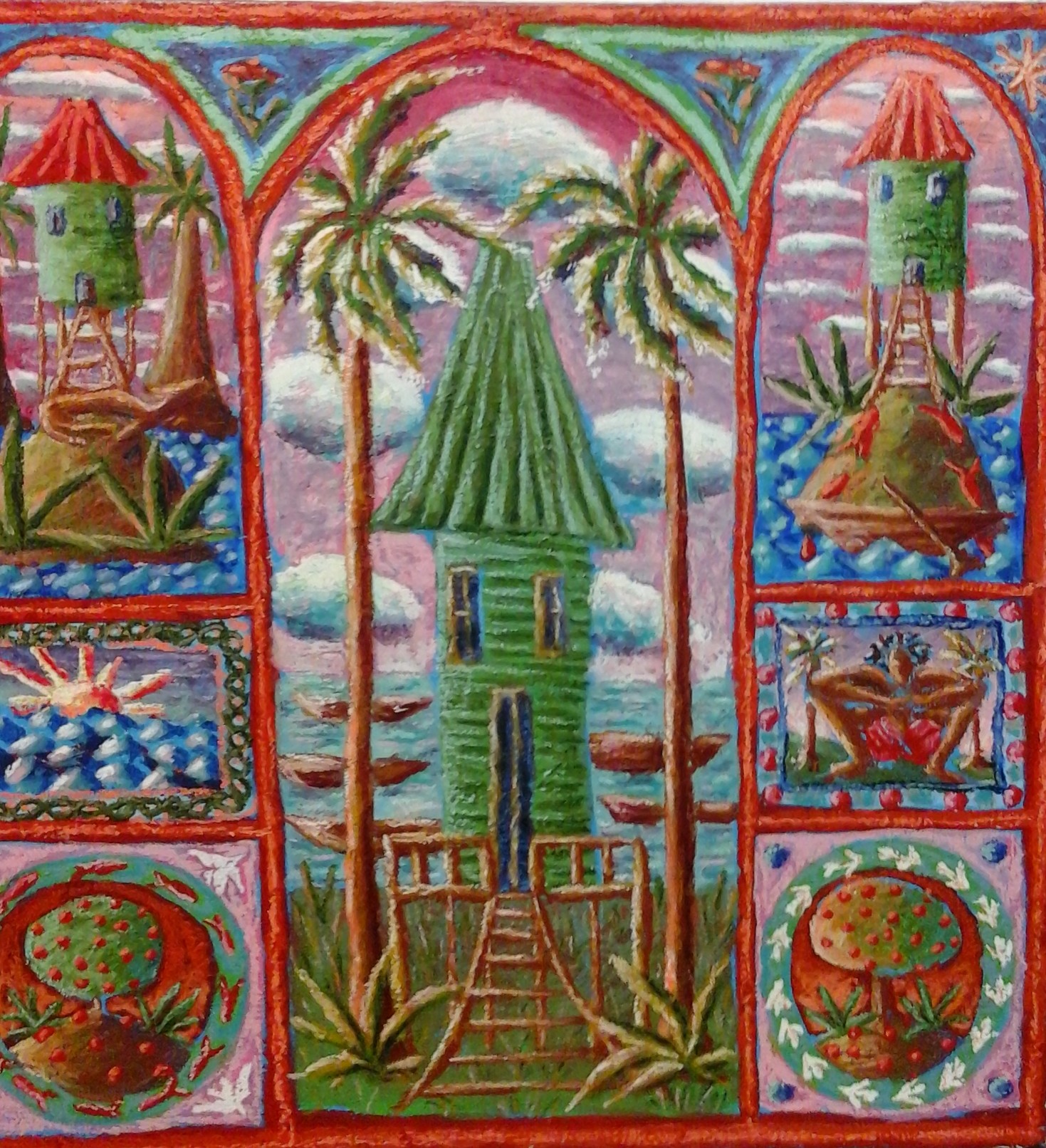 Grenada, one of the artist’s home, and residence is a place the artist describes as magical and conducive to the process of his work. Many images that one sees on the island are reflected in his works.
