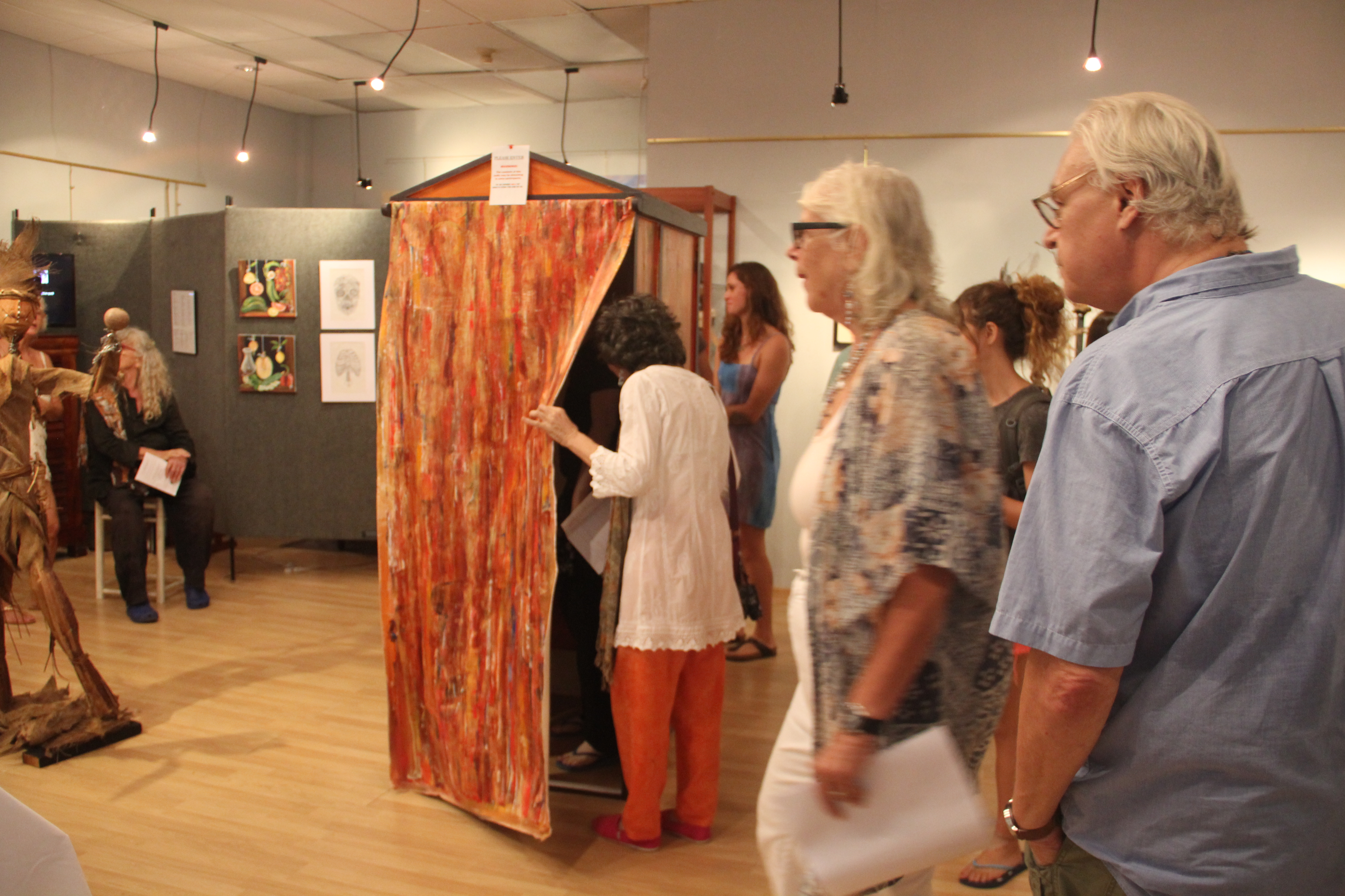 Also before you even get into the gallery itself you see Rene Froehlich’s work, his fibreglass figures evolving at every exhibit and Ingrid Newman’s work. Newman, from South Africa has settled in Grenada and made a beautiful chandelier piece that uses plastic refuse and naturally occurring material. Her treatment of the plastic was like lace in some places and was easily one of the most exquisitely executed pieces made from plastic and “trash” that we’ve seen. Oliver Benoit’s “confessional” piece in the middle of the gallery also attracted a lot of attention. The confessional itself is a commanding presence, a proverbial “elephant in the room” and mature audiences are invited inside to hear harrowing stories fed in through the confessional screen. These stories are all too common and one of the less than positive commonalities in the West Indies… putting us in the position where we are hearing them provokes the question, can we forgive? Who can be absolved?