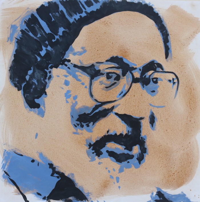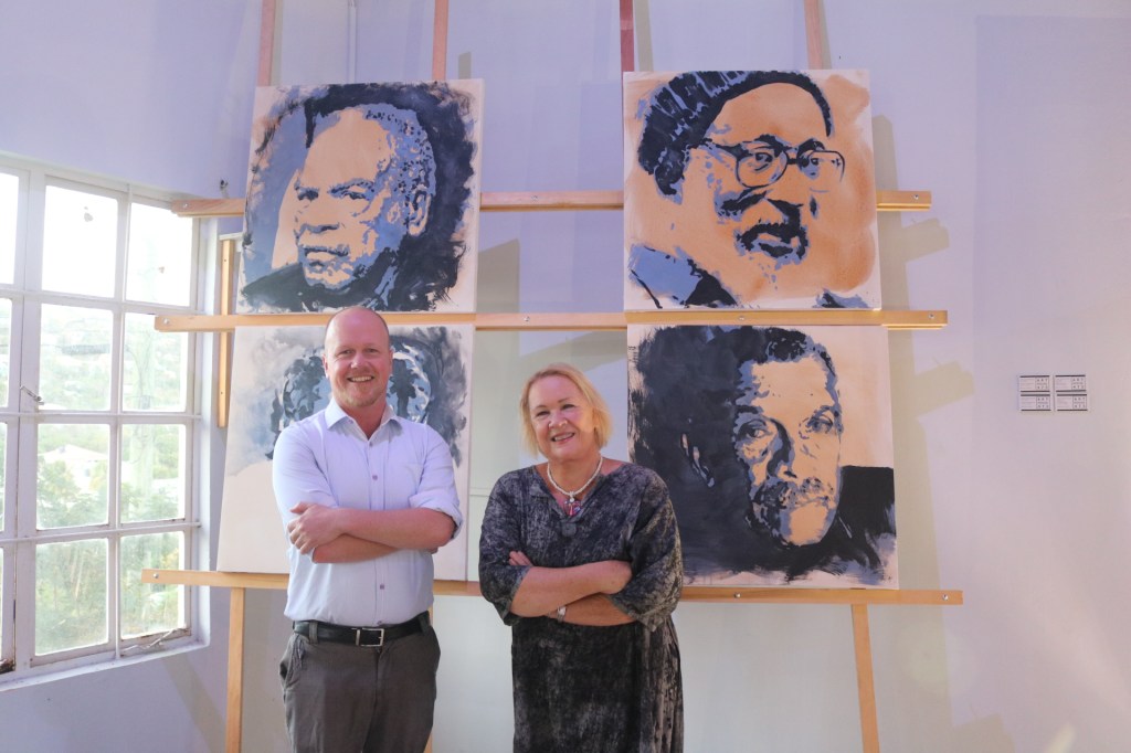 More traditional, Mains also showed portraits in paintings sitting on the structures. His chosen images were those of Caribbean language greats— Glissant, Walcott, Braithwaite, and Hughes. These paintings created a powerful effect as the men gazed out over the venue.