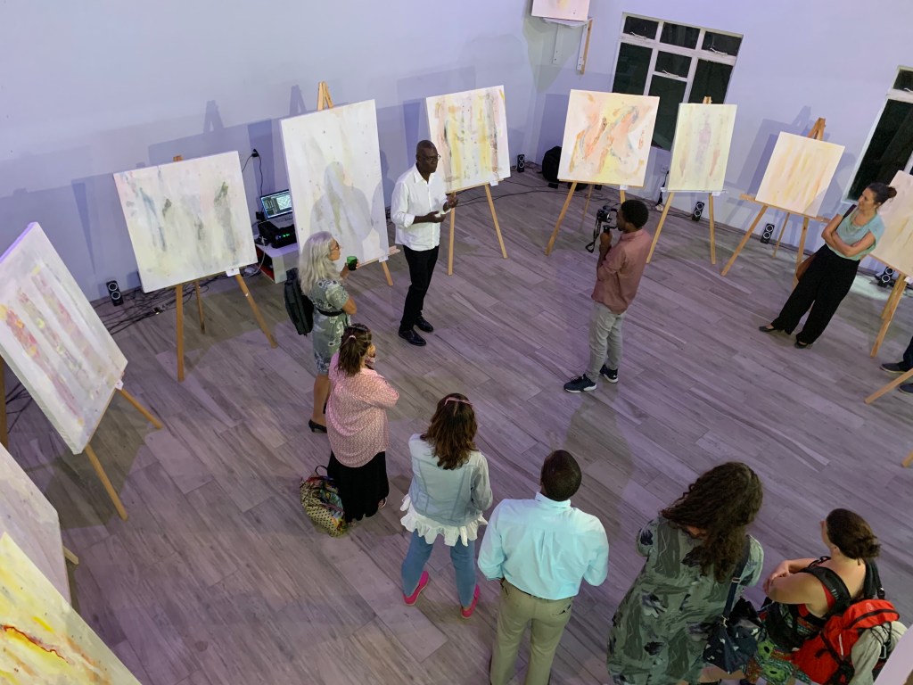 His exhibition opened at Art House 473 in Calliste on March 12th–the eve of the remembrance of the Grenada Revolution of the 13th. No one was thinking revolution–the impending virus invading Grenada was foremost on everyone’s mind. His students at St. George’s University received the notice that they would be shipped out to their home countries. Hotels were emptying, restaurants closing down, residents panic shopping for disinfectants and toilet paper, and the mind could not process looking back — we were only anticipating disaster.