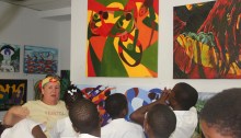 Susan Mains visits the 49th annual exhibit of the Grenada Arts Council with some children of Berean Christian Acadmey in Grenada