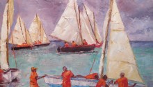 The sky is violet grey, maybe getting ready to be violent, but a streak of sunshine comes in from the west to illuminate the sails. The sailing continues.
